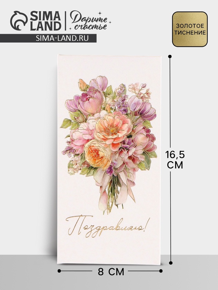 Конверт для денег «Поздравляю», цветы, тиснение, 16.5×8 см - товар, который Вы можете приобрести в нашем интернет-магазине. Заказ могут оформить как юридические, так и физические лица. Бесплатная доставка по Астане, также, отправляем по РК.