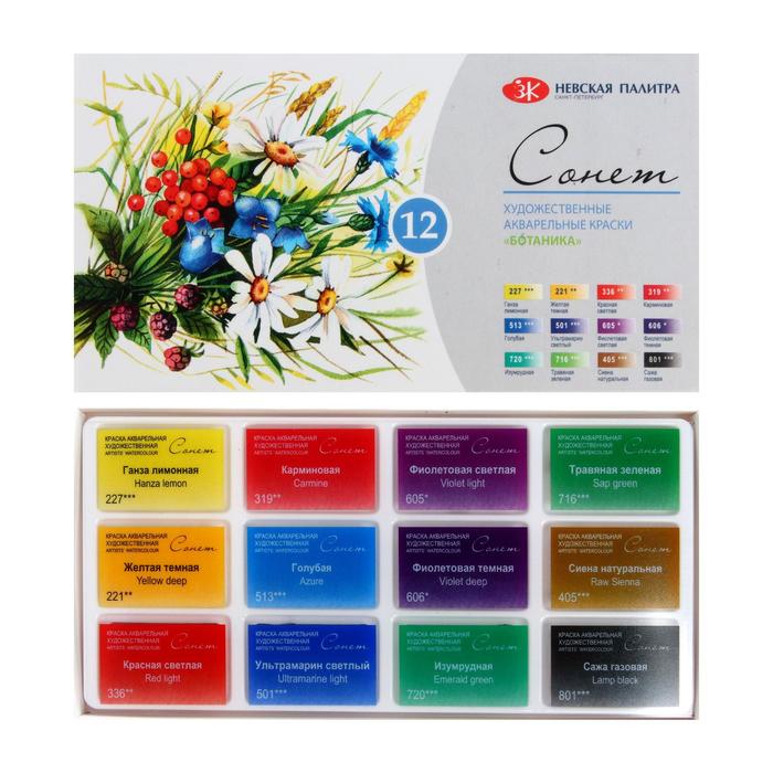 Художественные акварельные краски "Сонет" разработаны для начинающих художников, открывающих или совершенствующих свои творческие способности. Изготавливаются по современным рецептурам на основе преимущественно органических пигментов и синтетического связующего. Обладают интенсивностью цвета и прозрачностью. Превосходно смешиваются, размываются и легко берутся на кисть. Палитра набора акварели "Сонет" Ботаника состоит из специально подобранных 12 цветов акварели для написания работ с композициями из растений.
