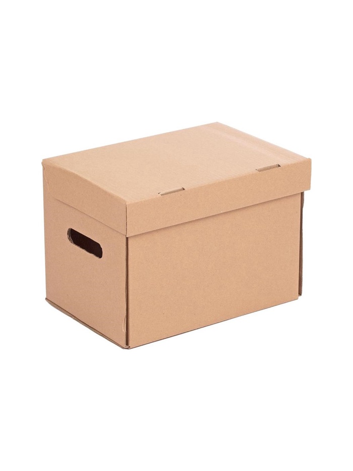 Он сделан из высококачественного бурого гофрокартона и способен выдерживать вес до 15–18 килограммов. У короба есть откидная крышка и отверстия по бокам для удобной переноски. Размер — 325235325 мм. Поставляется в разобранном виде и легко собирается без скотча и ножниц.