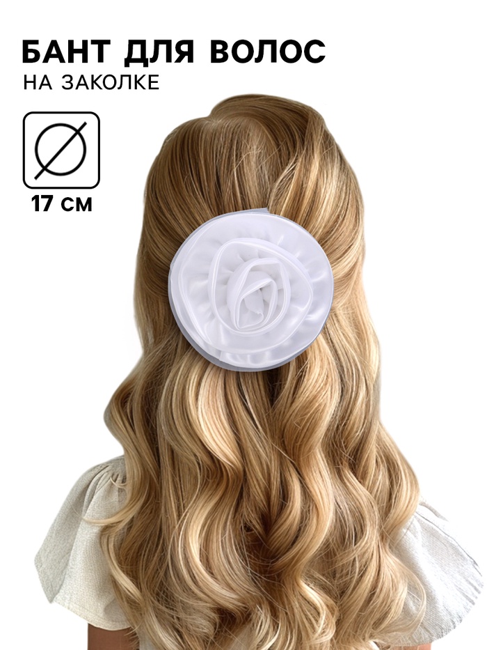 Элегантный объёмный бант из атласной ткани в виде роскошной розы. Диаметр 17 см, что делает его идеальным для праздничных образов: выпускной, свадьба, день рождения или фотосессия. Крепится на прочную эластичную резинку. надёжно фиксируется даже в густых волосах. Подходит для девочек от 3 лет и взрослых.