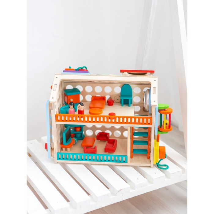 Бизидом — многофункциональная игрушка, которая одновременно является кукольным домом и бизибордом. На одной стороне бизидома находятся разные интересные элементы: ксилофон, выключатель, розетка, часы и многое другое, а другая его сторона выглядит как милый кукольный домик.