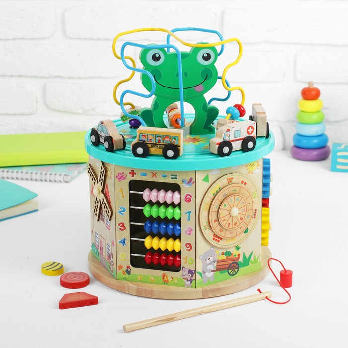 Развивающий куб «Лягушонок» — это многофункциональная игрушка для детей от 3 лет, выполненная в форме круглого бизиборда. Она сочетает в себе несколько игровых модулей, направленных на развитие логики и мелкой моторики. Идеально подходит для домашнего обучения и игр в детских садах.