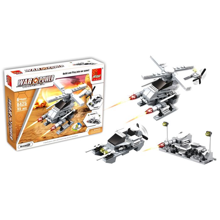 Игровой набор содержит 95 деталей и позволяет сконструировать три варианта техники: стационарный пулемёт, истребитель, вертолёт.