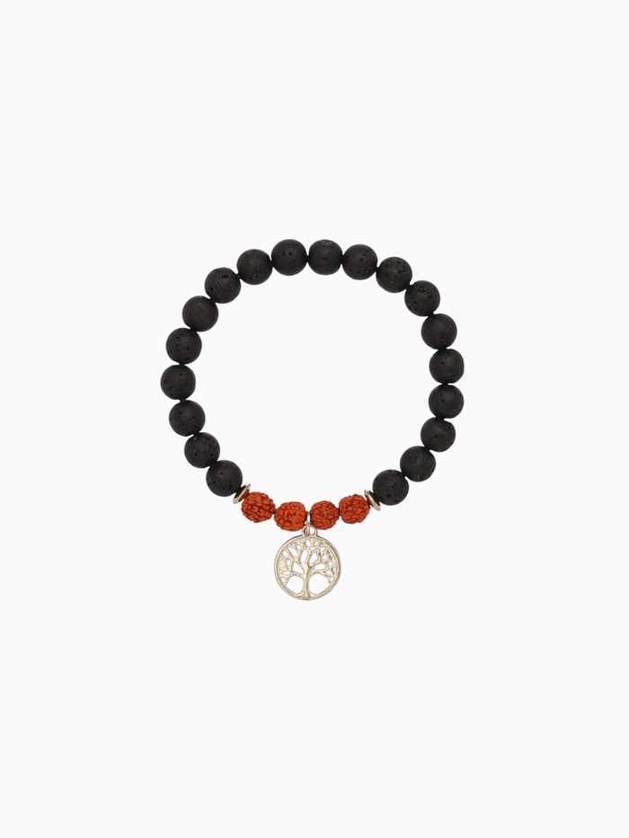 Вулканическая лава — камень заземления. Его пористая структура впитывает эфирные масла, но даже без них он помогает справляться с тревогой и перепадами настроения. Рудракша — “слеза Шивы” — стабилизирует биоэлектрические импульсы в теле, снижает стресс и поддерживает внутренний баланс. Вместе они создают браслет, который работает не на показ, а на состояние.