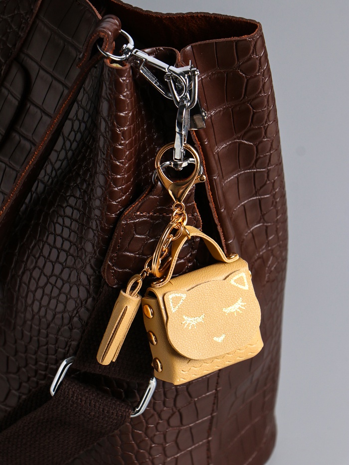 Этот брелок-котик с кисточкой — не просто аксессуар, а маленький друг для ваших ключей или сумки. Его нежный сливочный оттенок и элегантная форма в виде сумочки делают его универсальным спутником, который добавит шарма любому образу.