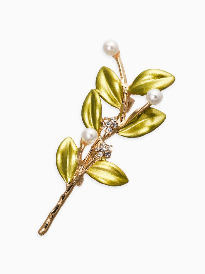 Нежная веточка с жемчужинами оживит ваш образ и наполнит его тонкими штрихами роскоши. Компактная брошь в духе природных мотивов имеет длину около 6,5 см и воплощает уникальную комбинацию белого жемчуга и свежей зелени, гармонично интегрированных в золото. Это изделие станет вашим верным спутником, подчёркивающим красоту лица и линии шеи.