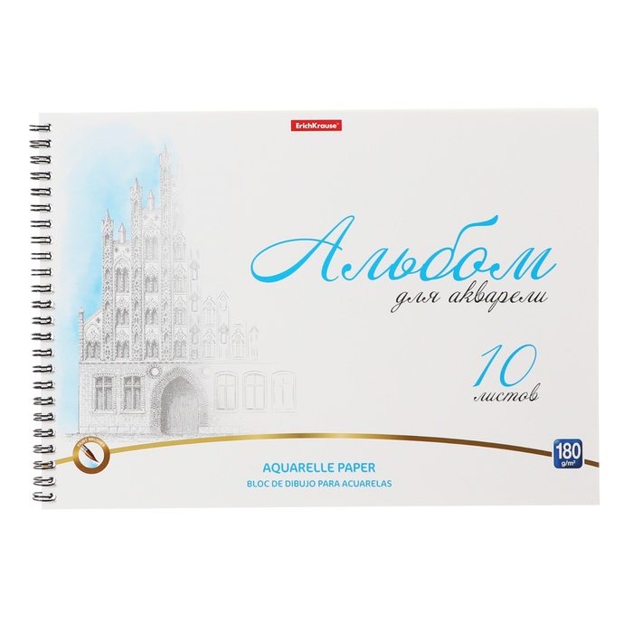 Альбом для рисования формата А4 (210х297 мм). Обложка из высококачественного мелованного картона плотностью 170 г/м2. Жесткая подложка 360 г/м2. В блоке 10 листов бумаги акварельной плотностью 180 г/м2. Специальный рыхлый верхний слой быстро впитывает воду, не позволяя краске растекаться. Белизна бумаги - 100%. Тип скрепления - спираль. Альбомы упакованы в термоусадочную пленку по 5 штук.