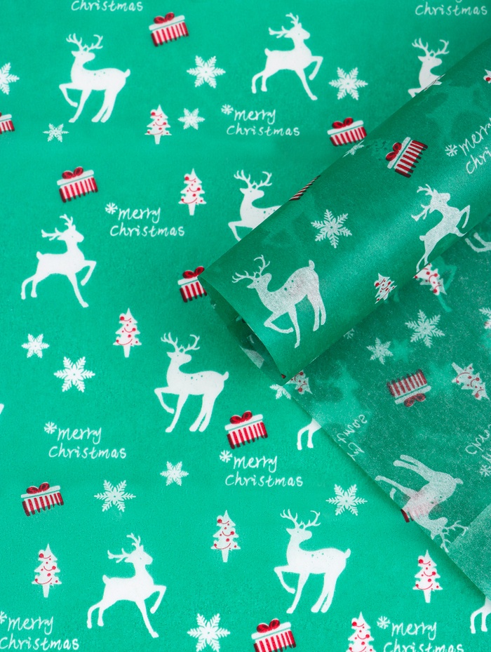 Для создания законченного образа: Бумагу можно комбинировать с красными или золотыми лентами, усиливая рождественскую цветовую палитру. Зеленая бумага тишью с надписью — выбор для тех, кто ценит сдержанность и классическую эстетику зимних праздников.