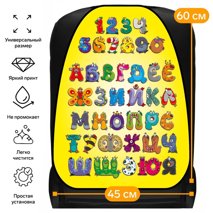 Накидки на сиденья автомобиля от бренда Cartage - это стильная и надежная защита кресел салона от загрязнения, царапин, истирания. Данная модель-незапинайка предназначена в первую очередь для защиты спинки переднего сиденья от обуви ребенка и от лап животных. Защитные накидки универсальны, подходят для любых марок автомобилей. Размер накидки 60 х 45 см. Благодаря яркому дизайну с качественной печатью, накидка украсит салон автомобиля и превратит поездку ребёнка в увлекательное путешествие. На выбор - различные варианты расцветок. Накидка-незапинайка Cartage выполнена из прочного материала, который не впитывает влагу и загрязнения, стойкий к истиранию, механическим повреждениям и царапинам. Легко очищается без специальных средств и не требует стирки.