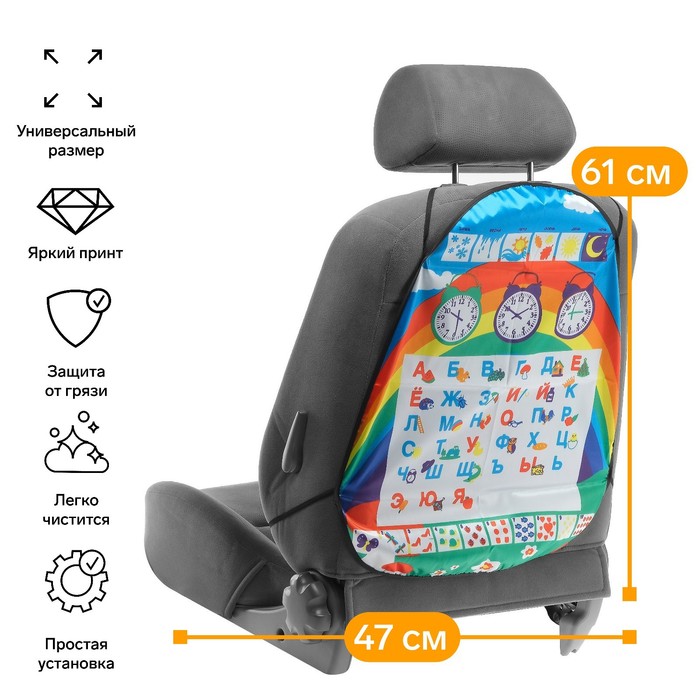 Накидка - незапинайка - это незаменимая вещь для автомобиля, чтобы спинки ваших сидений сохранялись в чистоте. Больше не нужно беспокоиться, что ваш ребенок запачкает их ножками, а яркие и красочные рисунки помогут занять и обучать вашего малыша. Незапинайка легко протирается влажной тряпкой или салфеткой. Высота 60 см