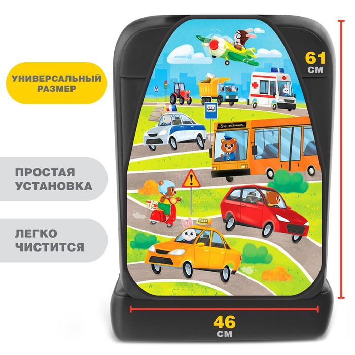 Яркий чехол ТМ «Крошка Я» сохранит в чистоте переднее сиденье автомобиля. Используйте это специальное приспособление, чтобы малыш не запачкал ботиночками спинку кресла.
