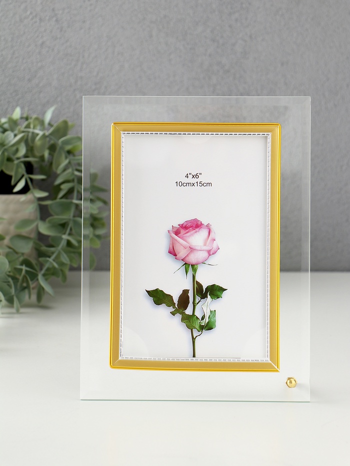 Эта прозрачная стеклянная фоторамка превратит ваше любимое фото 10×15 в изящный акцент для дома или офиса. Универсальный дизайн с золотой окантовкой и цветочным мотивом гармонично впишется в любой интерьер, подчеркивая значимость момента.