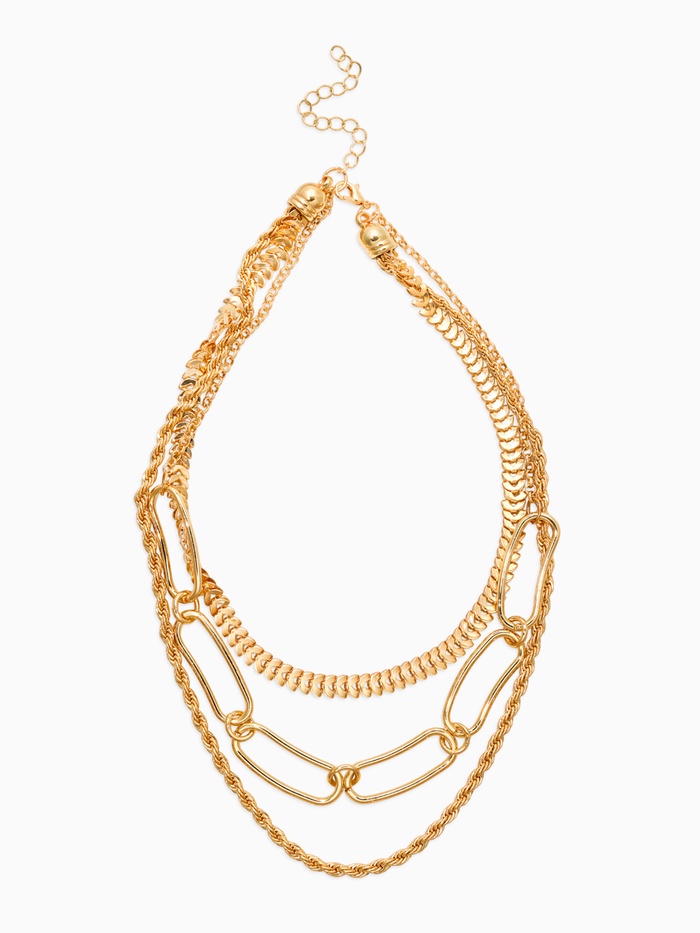 Три цепи золотистого цвета разной длины образуют гармоничный многослойный ансамбль, который выделяется своей утончённостью и лаконичностью. Чистота формы и отсутствие вставок подчёркивают минималистичный дизайн, делая украшение универсальным акцентом для любых образов. Стандартный карабин надёжно фиксирует украшение, обеспечивая лёгкость эксплуатации и комфорт в повседневной жизни.