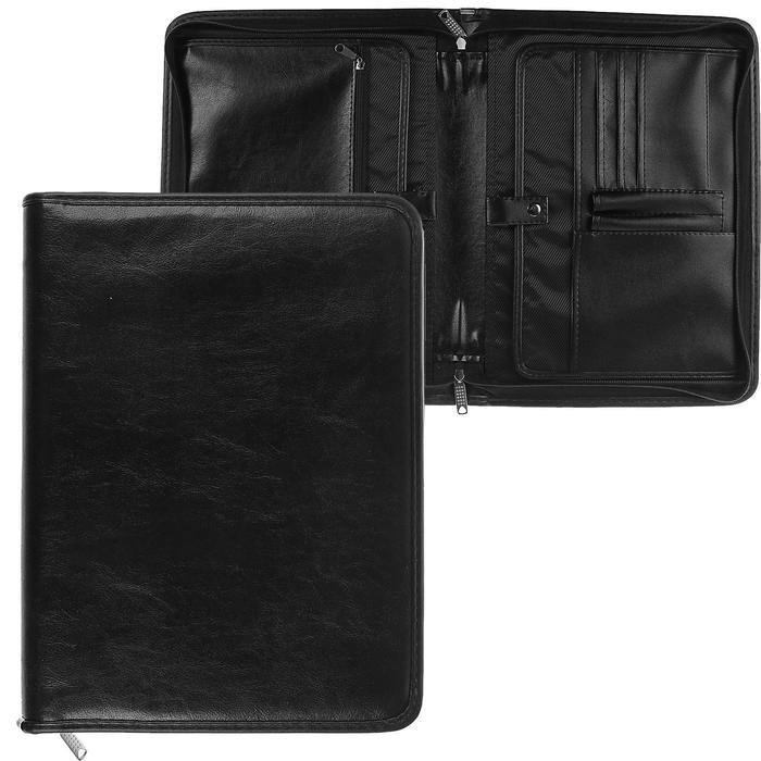 Представительная деловая папка на молнии.Изготовлена из черного К/З Люкс.Размер изделия 270 на 370 мм. Толщина папки - 50 мм.Ручка для удобсва переноса.Внутри расположено удобных, 2 откидных клапана с карманами на молнии, отделение под докумены, везитки и ручки.