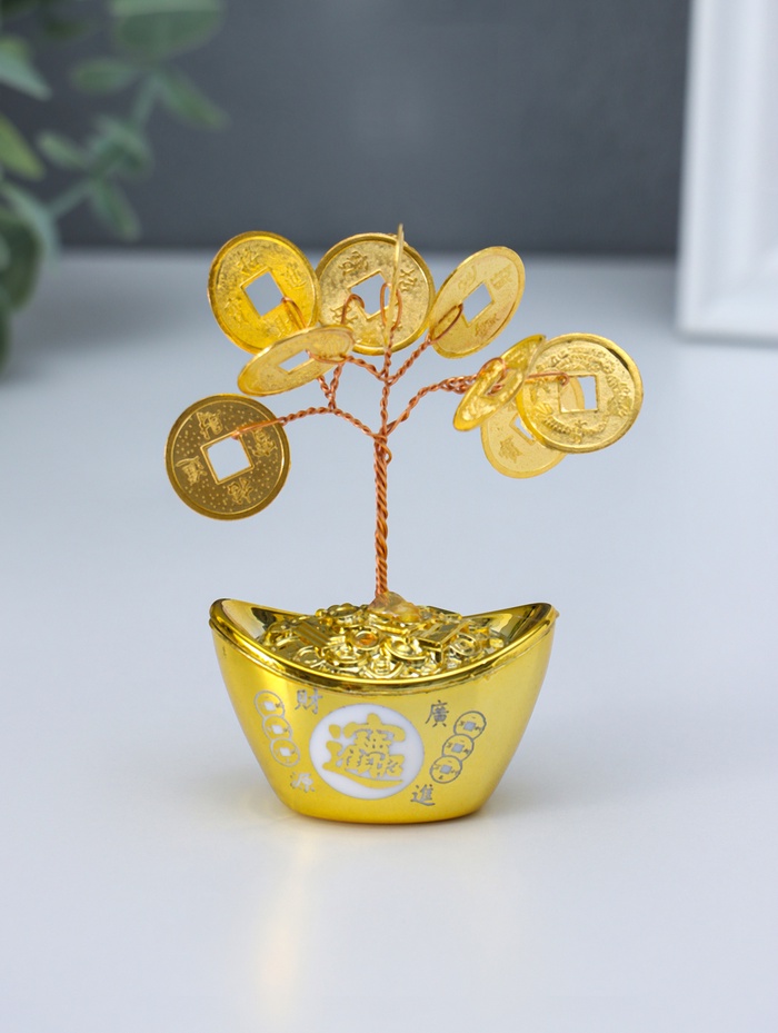 Этот сувенирный бонсай с золотыми монетами — символ процветания и стабильного финансового роста. Миниатюрное дерево из слитка и девяти монет привносит в интерьер энергию благополучия. Композиция служит стильным акцентом для рабочего кабинета, домашнего офиса или зоны отдыха, напоминая о важности мудрого управления ресурсами.