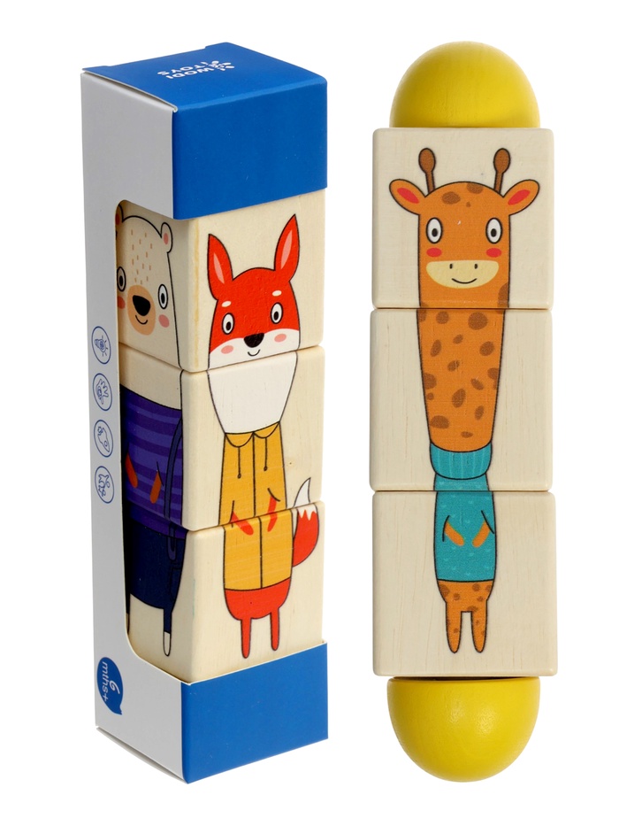 Первые шаги в мире логики и образов — в простой и понятной игре. Деревянные кубики с изображениями животных — это компактный развивающий набор, который помогает ребёнку тренировать внимание и собирать цельную картинку из трёх вращающихся элементов.