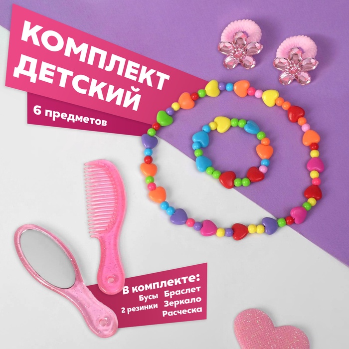 Этот набор детских украшений — идеальный подарок для маленькой модницы! В набор входят бусики, кольцо, браслет, клипсы и аксессуары для волос. Яркий дизайн каждого предмета привлечет внимание и добавит индивидуальности любому наряду.