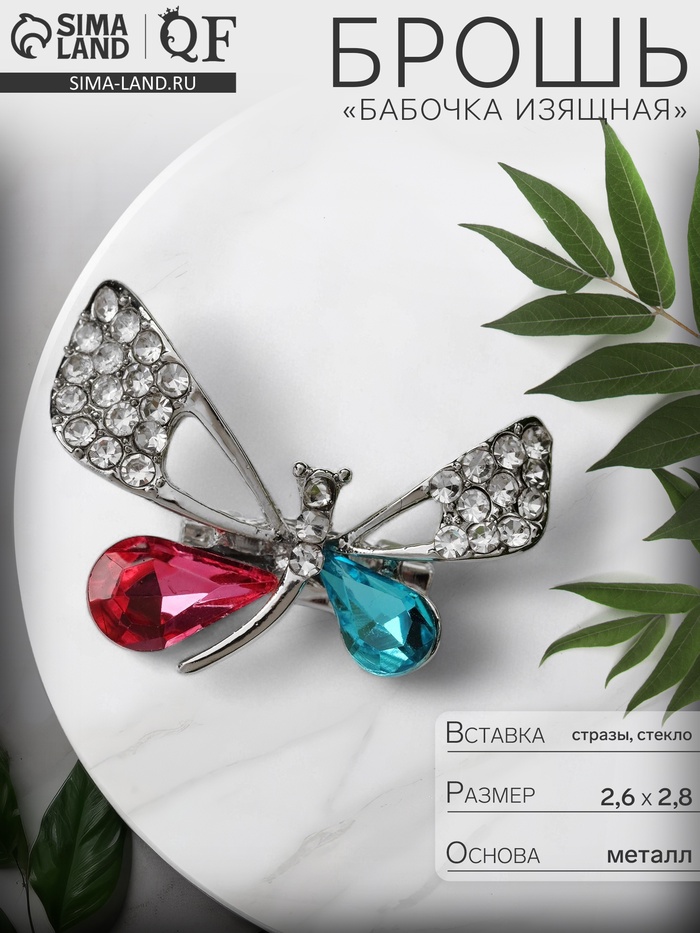 Изготовленная из прочного металла с серебристой фурнитурой, брошь украшена разноцветными стразами и стеклянными вставками, которые играют на свету, создавая эффект мерцания и подчеркивая изысканность изделия. Такая комбинация материалов гарантирует долговечность и надежность в повседневном использовании.