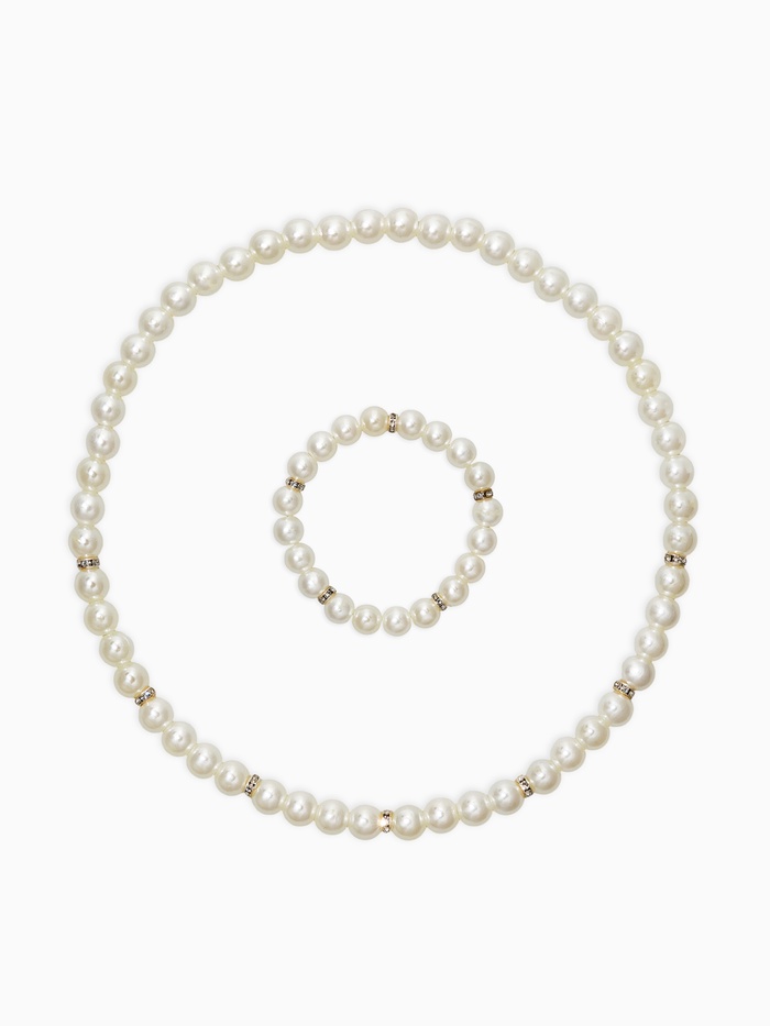 Девочкам, мечтающим чувствовать себя особенными, предлагаем уникальный набор украшений «Выбражулька»: нежные белые бусы и стильный браслет, украшенные блестящими стразами, напоминают сверкающие жемчужины морской волны.