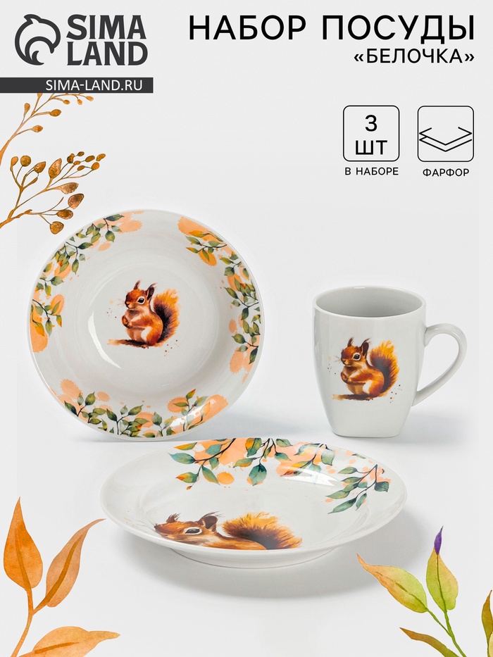 Этот набор создан для реальной жизни. Тарелка подходит для порций каши или салата, миска идеально справляется с первыми блюдами, а кружка удобна для горячих напитков. Белый цвет подчеркнёт любую сервировку, а "белочка" на поверхности добавит нотку радости и тепла.