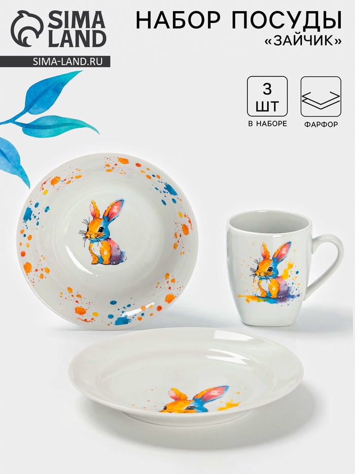 Этот набор создан для реальной жизни. Тарелка подходит для порций каши или салата, миска идеально справляется с первыми блюдами, а кружка удобна для горячих напитков. Белый цвет подчеркнёт любую сервировку, а "зайчик" на поверхности добавит нотку радости и тепла.