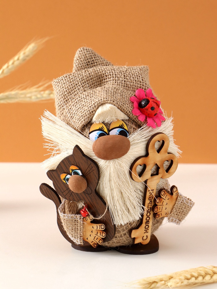 Этот оберег воплощает в себе тепло домашнего уюта и защиту семьи. Фигурка изображает Домового Захара — хранителя домашнего очага, в компании котика и символичного ключа, что подчёркивает его роль в охране вашего жилища от негатива и невзгод. Высота изделия составляет 20 см, что делает его заметным, но гармоничным элементом декора.