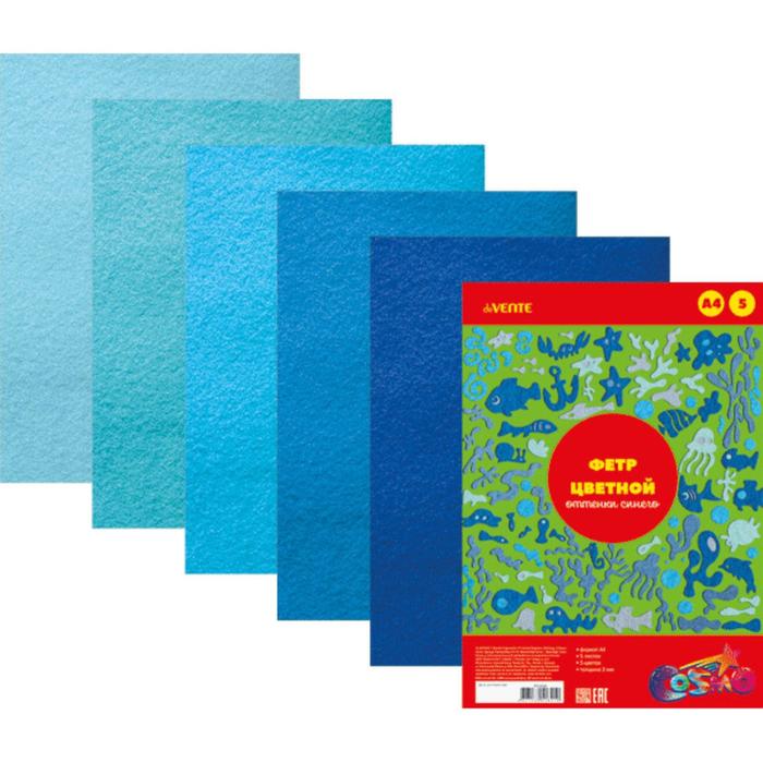 Фетр цветной мягкий A4 "deVENTE. Оттенки синего" 5 цветов, 5 листов, толщина 2 мм, пластиковый пакет с европодвесом