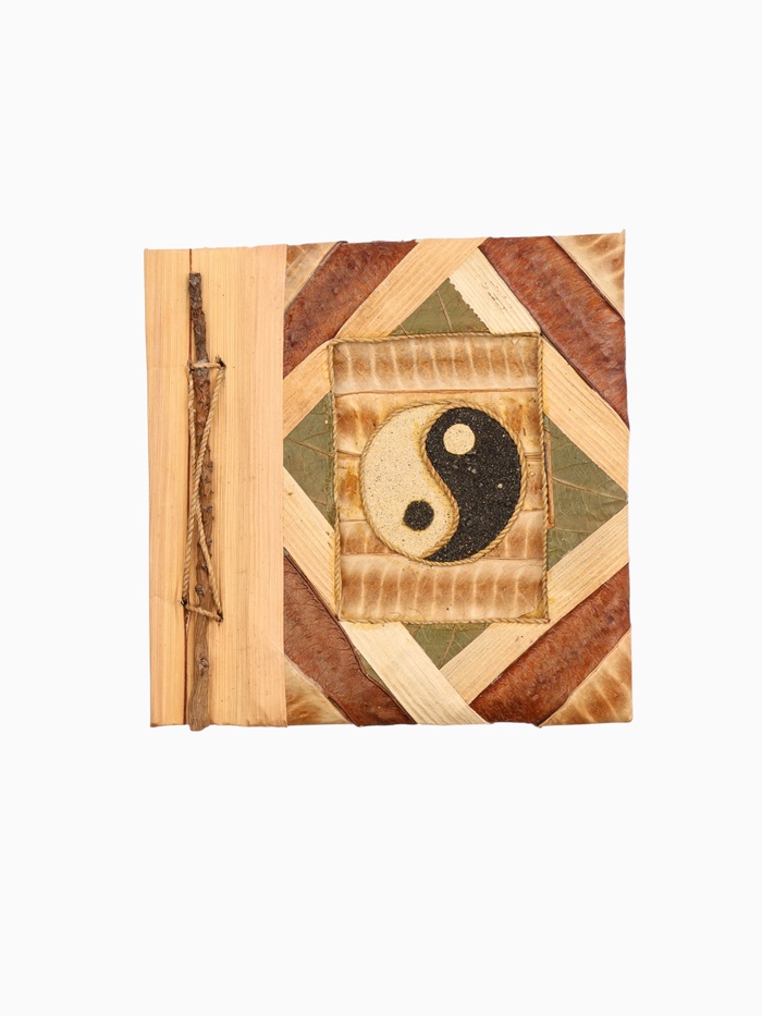 Квадратный фотоальбом в твёрдом переплёте из натурального пальмового листа с символикой инь-янь. Его лаконичный дизайн и природная фактура создают гармоничное обрамление для фотографий, превращая альбом в предмет для размышления и созерцания.