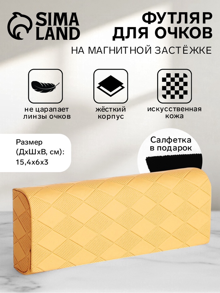 Футляр для очков – стильный и надежный аксессуар для современных женщин. Изготовленный из искусственной кожи в светло-жёлтом оттенке, он сочетает в себе элегантность и практичность. Жёсткий корпус защищает ваши очки от повреждений, а удобный магнитный замок обеспечивает лёгкое открывание и закрывание. При длине 15,4 см он идеально подходит для различных размеров очков.