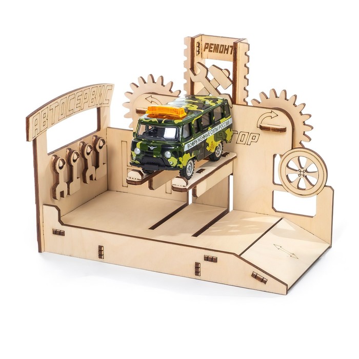 Конструктор «Автосервис» — это игрушка и развивающий конструктор, превосходный подарок для любителей машинок. Изготовлен из берёзовой фанеры толщиной 4 мм, за счёт чего имеет повышенную прочность.