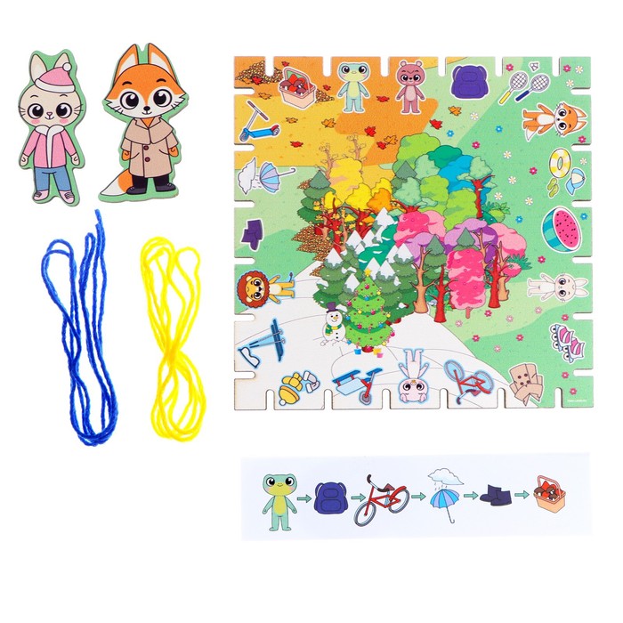 Суть игры - повторить путь со схемы на доске с помощью нити. Выберите с ребёнком фигурку, которой будете играть, обмотайте её ниткой. Затем предложите малышу выбрать схему. Разматывайте нить, зацепляя её за выемки на доске согласно схеме.