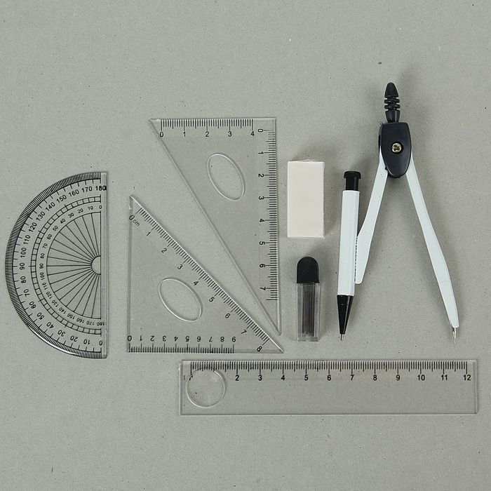 Циркуль металлический 120 мм в пластиковом пенале, с механическим карандашом, грифелями, ластиком, линейкой, 2 треугольниками и транспортиром