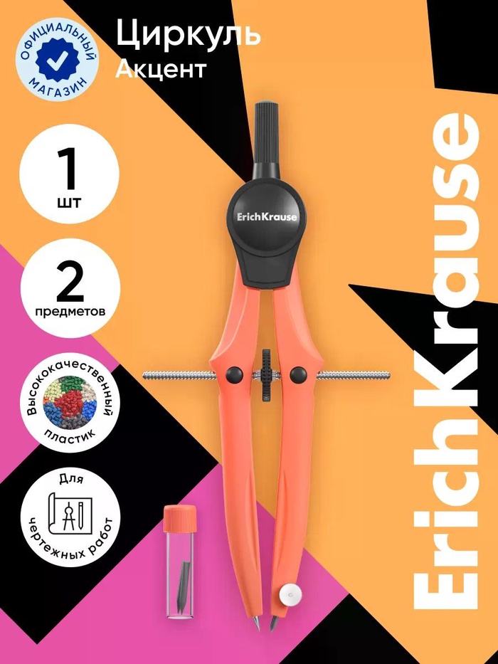 Пластиковый циркуль с максимальным радиусом 130 мм. В комплект входят сменные грифели в пластиковом контейнере.