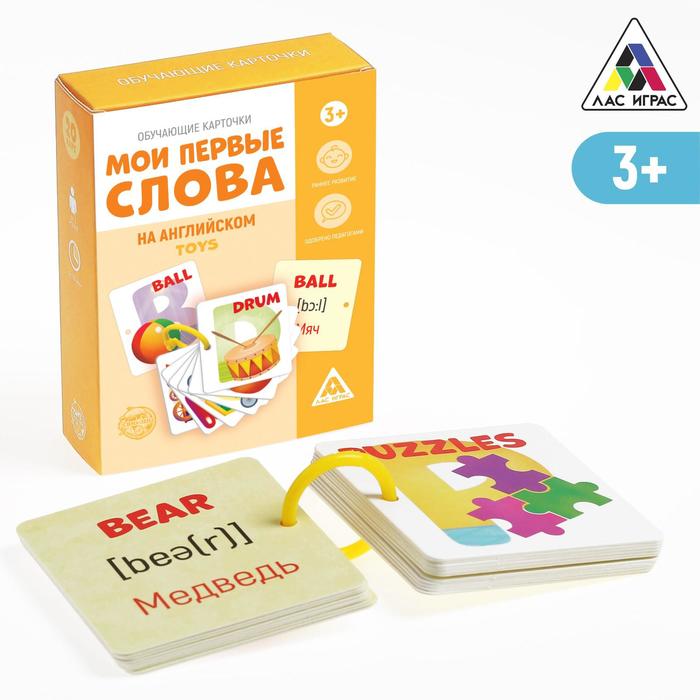На одной стороне карточки вас ждут красочные изображения игрушек. На другой — их названия на английском языке, транскрипция и перевод на русский.