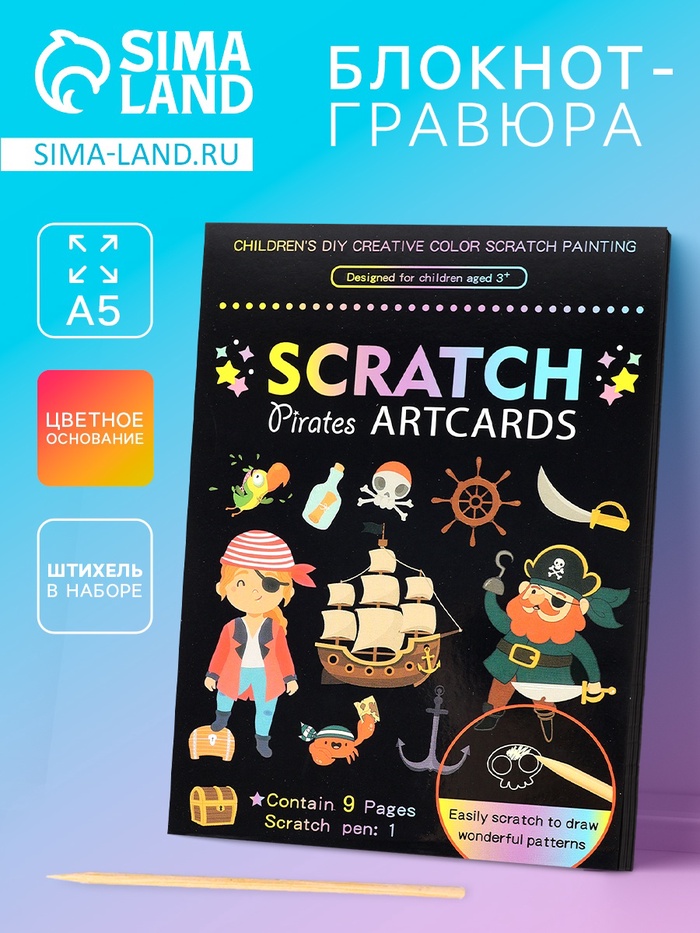 На чёрную основу уже нанесён контур рисунка. Задача ребёнка аккуратно процарапать штихелем белые контуры, чтобы получить яркую картинку!