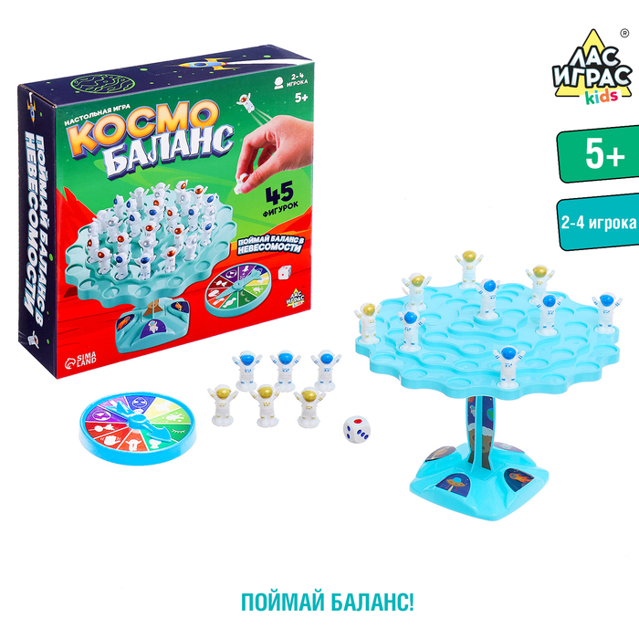 «Космо баланс» — настольная игра для детей от 5 лет. Космонавты отправляются в захватывающее космическое путешествие. Маленьким исследователям предстоит выставить свои фигурки на платформу и сохранить равновесие.