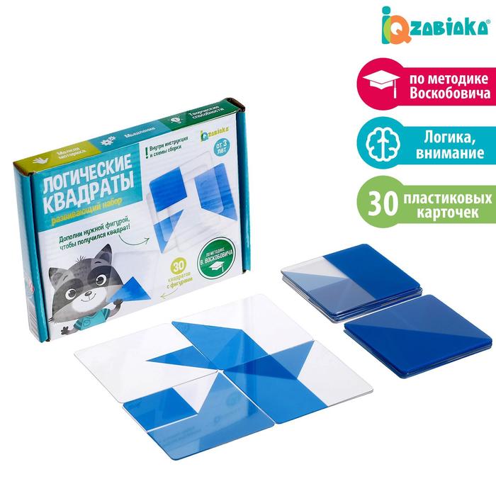 Внутри вы найдёте 30 пластиковых квадратов и инструкцию с вариантами занятий и схемами фигурок для сборки.