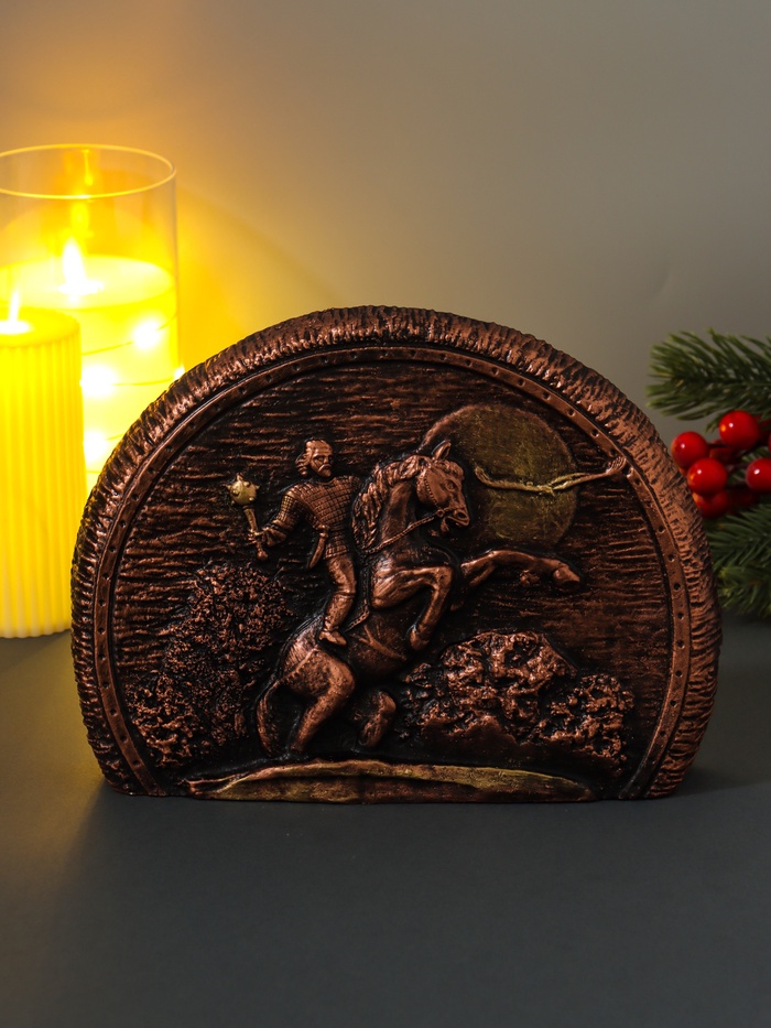 Представляем величественный элемент декора, который наполнит ваш дом духом героизма и благородства — гипсовую фигурку богатыря на коне. Её коричневый цвет и полуовальная форма создают атмосферу силы и уверенности, делая её универсальным аксессуаром для любого интерьера.