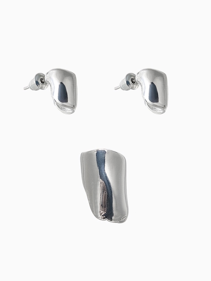 Набор из трёх серебристых украшений — сочетание каффа без прокола и классических серёжек-гвоздиков — воплощает современный минимализм и продуманную элегантность. Компактная длина 1,5 см делает аксессуары универсальными и удобными для ежедневного ношения, подчёркивая утончённый вкус и индивидуальность.