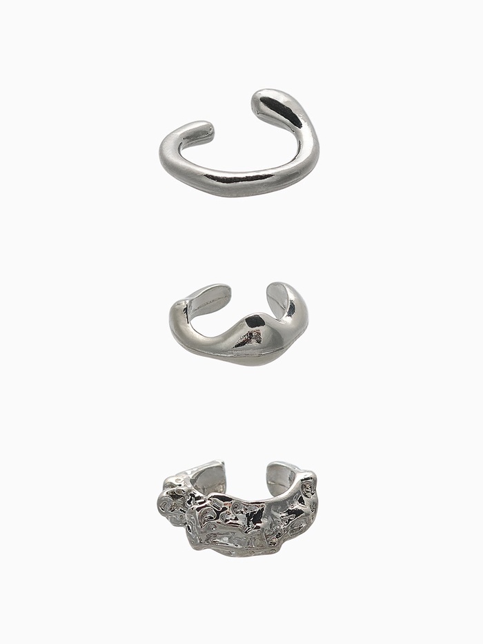 Набор из трёх серебристых каффов с эффектом мятости предлагает современный взгляд на украшения без прокола, идеально подходящий для женщин, ценящих минимализм и оригинальность. Каждый кафф длиной 1,5 см изготовлен из качественного металла, что гарантирует долговечность и комфорт при носке.