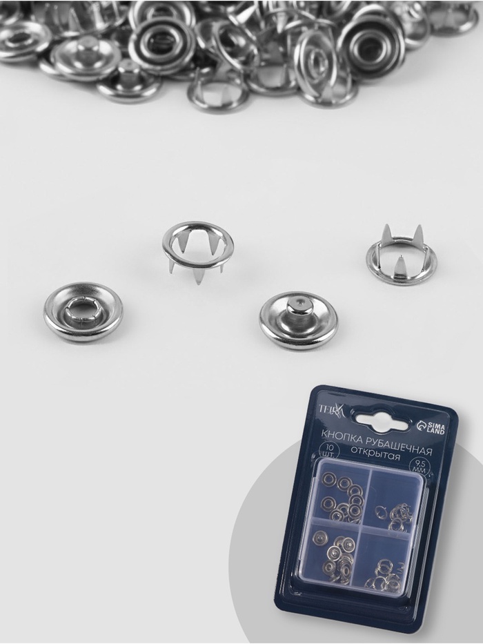 Аккуратная застежка для рубашек и легкой одежды — серебристые кнопки 9,5 мм из нержавеющей стали. Комплект из 10 штук в удобном боксе подойдет для ремонта фурнитуры или пошива новых вещей. Миниатюрный размер сохраняет незаметность, а прочный металл гарантирует долгий срок службы.
