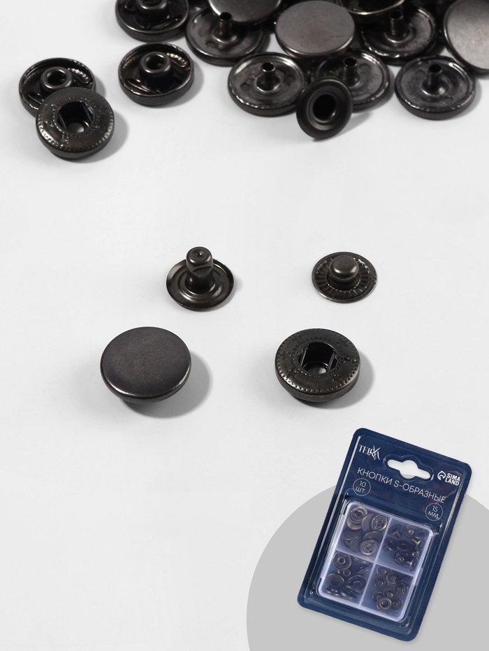 Прочные застежки для плотных материалов — черные S-образные кнопки 15 мм из нержавеющей стали. Набор из 10 штук в удобном боксе подойдет для работы с кожей, джинсой и техническими тканями. Усиленная конструкция выдерживает частые расстегивания без деформации.