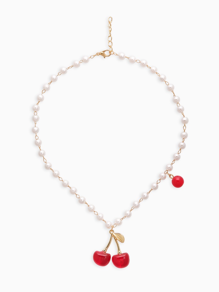 Эффектное колье на жемчужной дорожке с объёмной подвеской в виде яркой вишни — это украшение, которое гармонично сочетает в себе классическую элегантность и современную игривость. Белоснежные бусины диаметром 6 мм на пластиковой основе создают лёгкий и воздушный образ, а золотистая фурнитура подчёркивает изысканность изделия.