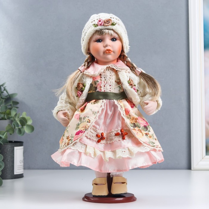Кукла коллекционная керамика "Алёна в розовом платье и белой вязаной кофте" 30 см