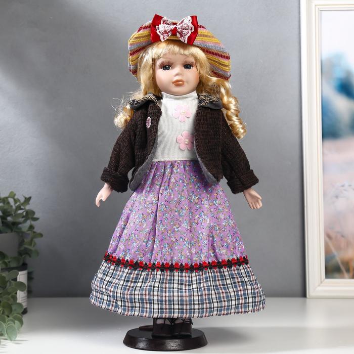 Кукла коллекционная керамика "Блондинка с кудрями, сиреневая юбка, шляпка полоски" 40 см