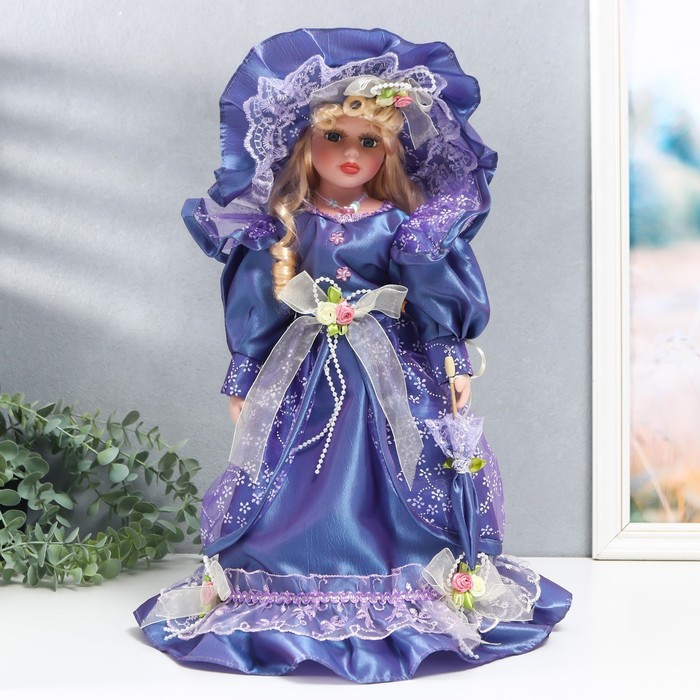 Кукла коллекционная керамика "Леди Анабель в синем платье с кружевом" 40 см
