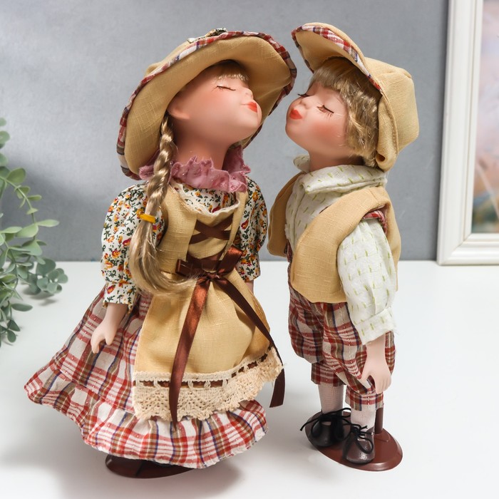 Кукла коллекционная парочка поцелуй набор 2 шт "Наташа и Олег в нарядах в клетку" 30 см