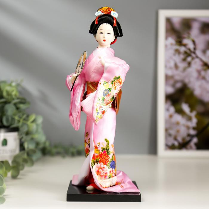 Кукла высотой 25 см облачена в роскошное розовое кимоно, украшенное изящными узорами, а в её руках — традиционное опахало, добавляющее образу завершённости. Устойчивая подставка позволяет надёжно разместить фигурку на полке или в витрине, делая её заметным акцентом в любой коллекции.