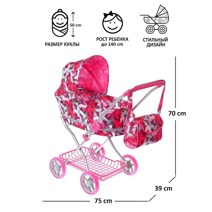 Коляска складывается и занимает мало места. Корзина в комплекте будет служить местом хранения для всех необходимых вещей ребёнка и его пупса. Размер сумки: 23 × 11 × 17 см.