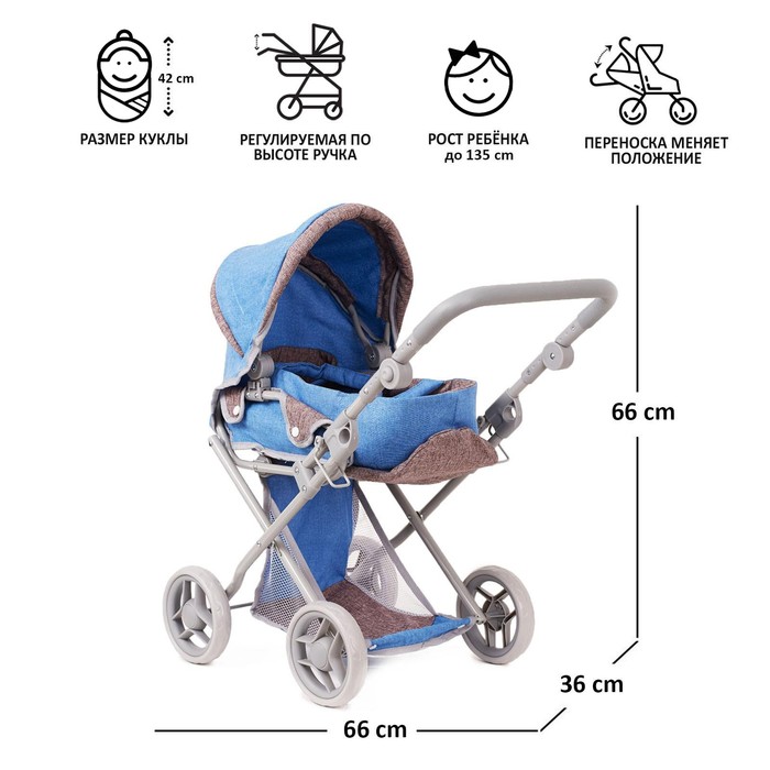 Материал каркаса выполнен из металла, колёса резиновые. Размер коляски: 66 × 36 × 66 см; размер люльки: 42 × 20 × 12 см. В комплекте представлены корзина и переноска.